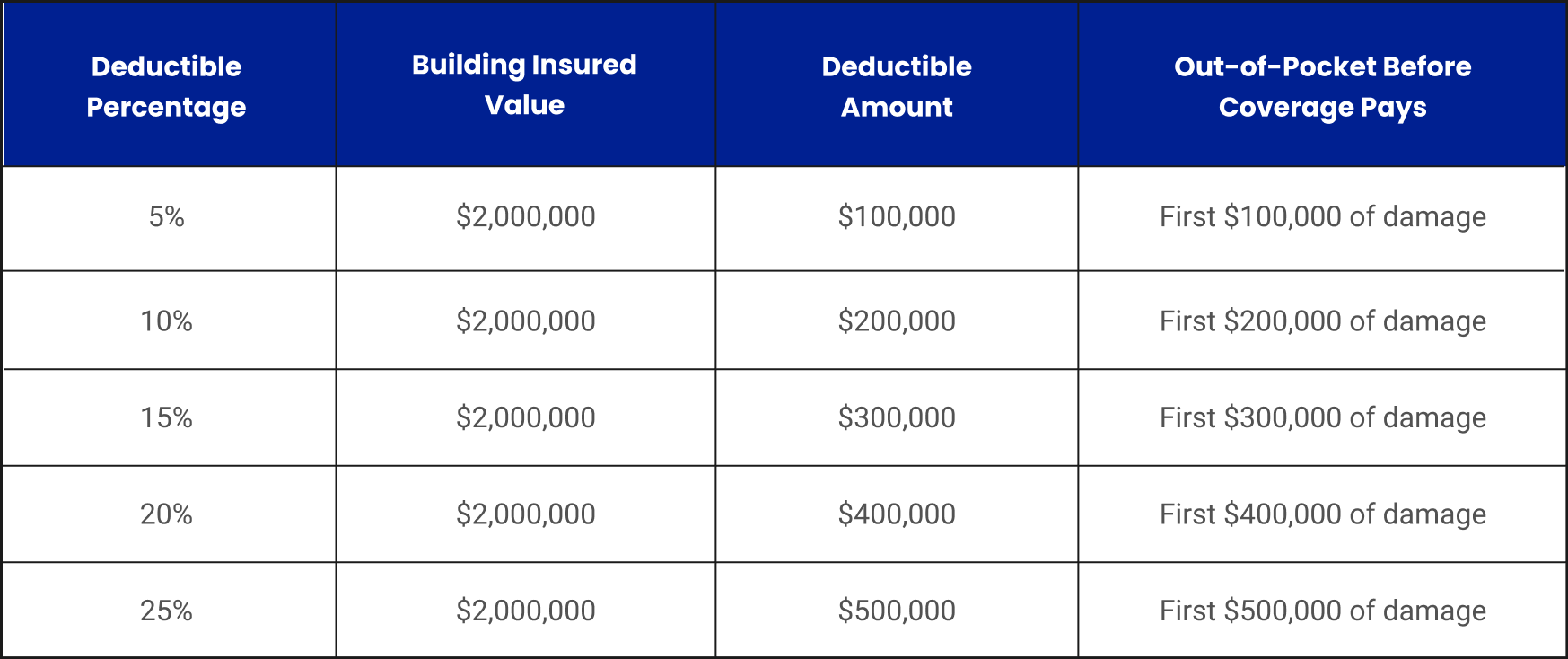 Lower deductible percentages reduce your out-of-pocket exposure but significantly increase annual premiums. A 5% deductible policy may cost 40% to 60% more than a 15% deductible policy on the same building. Most commercial property owners select deductibles in the 10% to 15% range as a balance between affordability and meaningful loss protection.