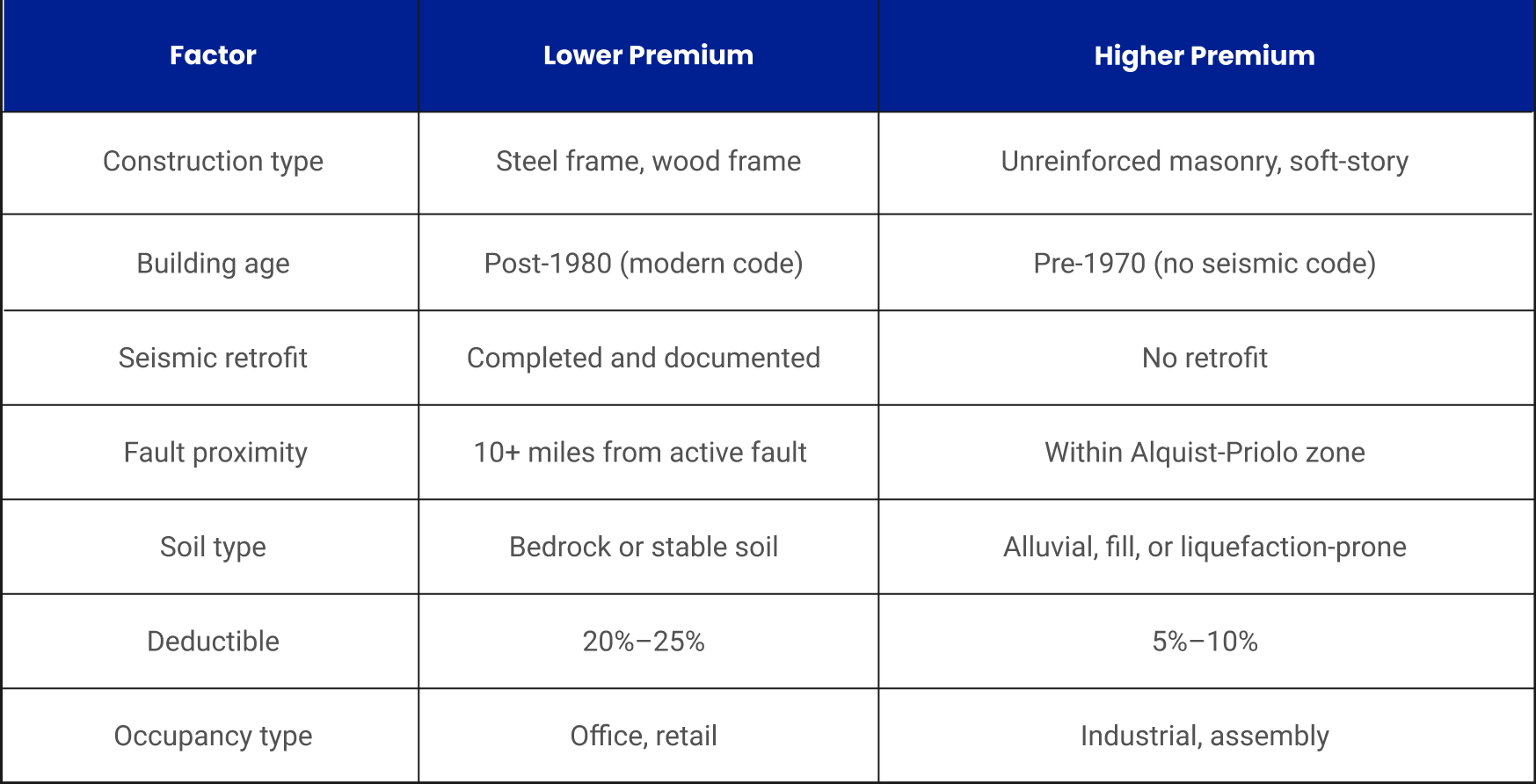 Seismic Retrofit Investment — Properties with documented seismic retrofitting receive lower premiums and broader coverage availability. The retrofit investment reduces both the probability of severe damage and the ongoing insurance cost — often paying for itself within 5 to 10 years through premium savings.